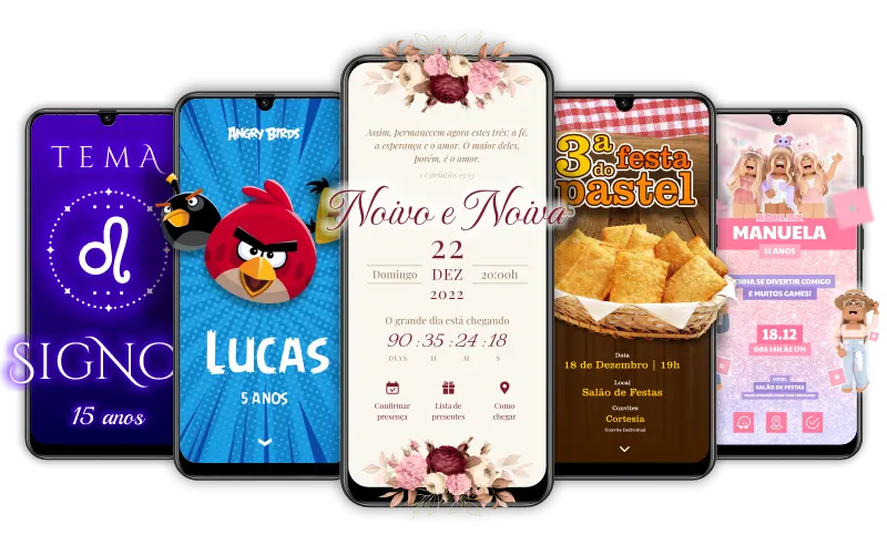 Temos modelos de convites digitais para diversas ocasiões: casamentos, 15 anos, aniversários, chá de cozinha, chá revelação, festas e eventos em geral.